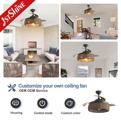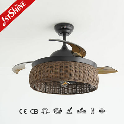 Verfügt über einen handgewebten Rattankäfig-Lampenschirm, der jedem Raum Eleganz im Bauernhausstil verleiht. |