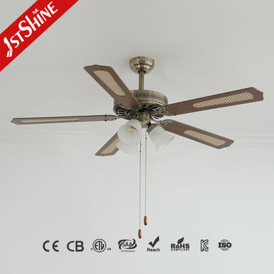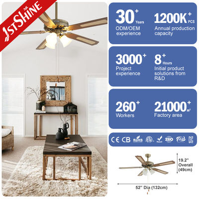 Messing-Deckenventilator, eine perfekte Mischung aus Stil und Funktionalität. Dieser 52-Zoll-Ventilator verfügt über eine antike Messingoberfläche, die zu jeder Raumdekoration passt, während die fünf Holz-MDF-Flügel für eine optimale Luftzirkulation sorgen. Ausgestattet mit einer Zugkette zur einfachen Steuerung bietet dieser Ventilator eine reversible Motorfunktion, um den Komfort das ganze Jahr über zu erhalten, indem er Sie im Sommer kühl und im Winter warm hält.