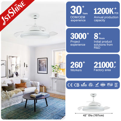 | Energieeffizienz | Sein einziehbarer Deckenventilator kommt mit weißem Körper und transparenten Klingen, die modern und einfach aussehen. |